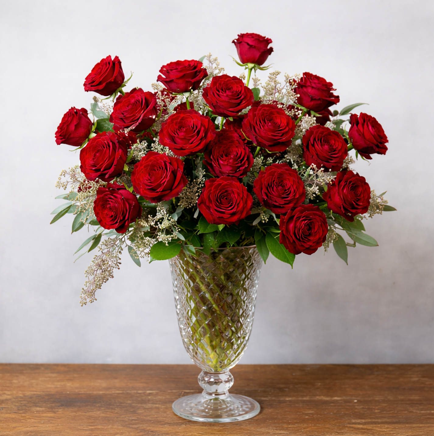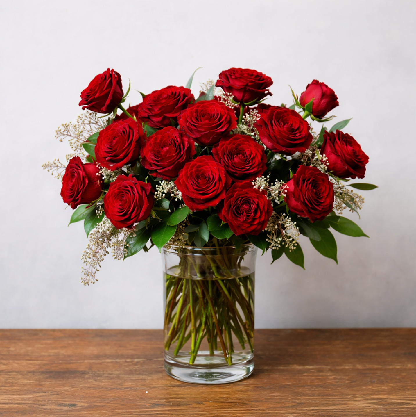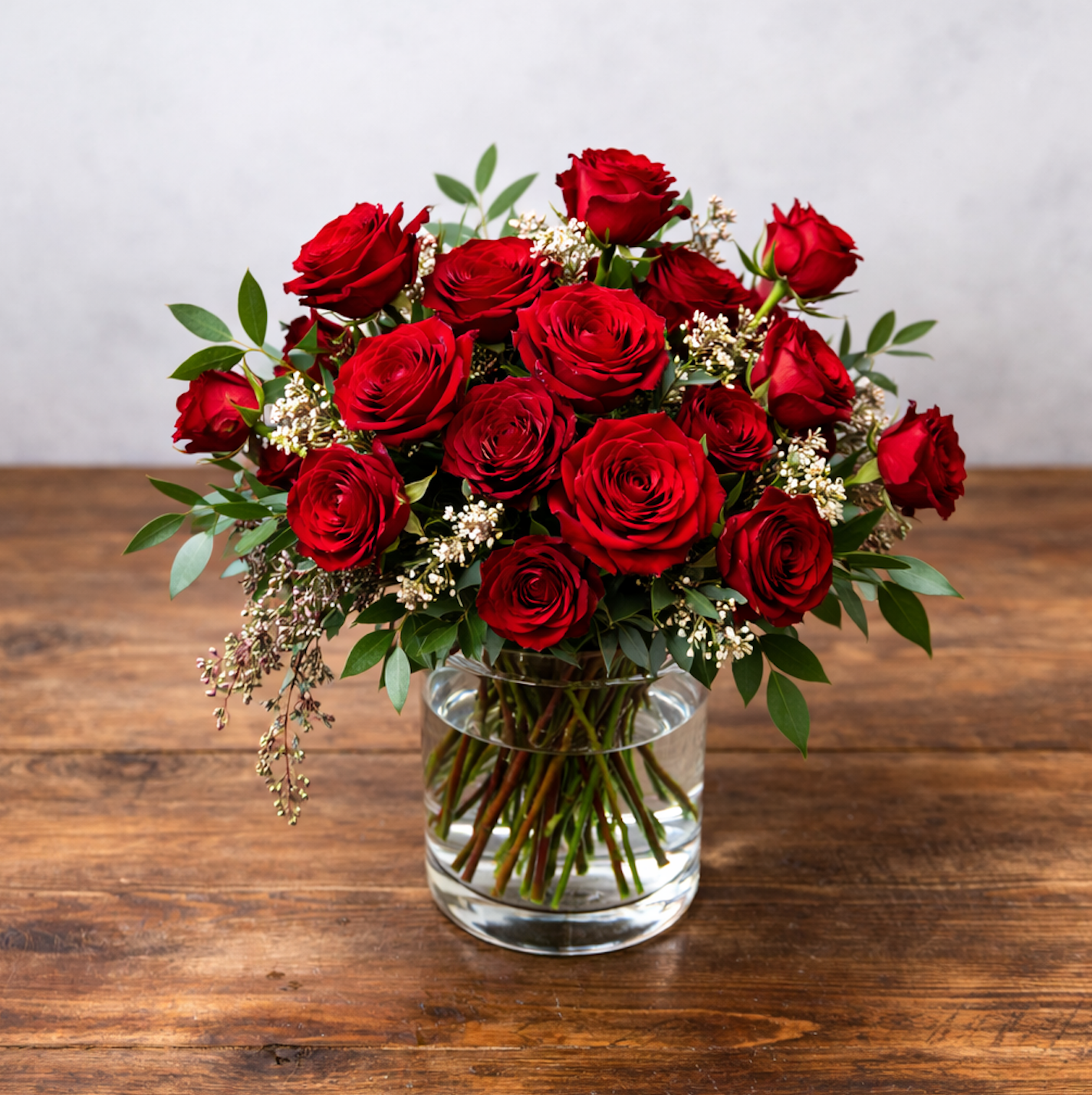 Vibrant premium red roses paired with fresh seasonal greenery create a timeless arrangement perfect for any occasion. Ideal for celebrations, romantic gestures, or simply brightening someone's day.