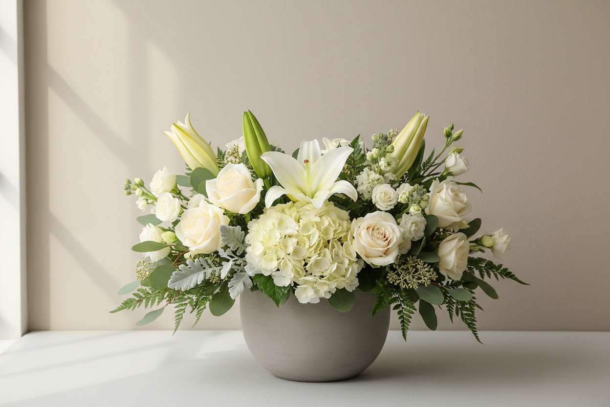 Harmony brings together the finest white and green florals in a deluxe arrangement that speaks to elegance and balance. Crisp white blooms pair beautifully with lush green accents, creating a sophisticated composition perfect for celebrations, sympathy, or simply brightening any space.